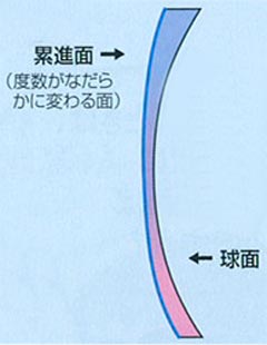 レンズの内面に累進面(度数がなだらかに変わる面)をもつレンズ設計。外面は球面設計。